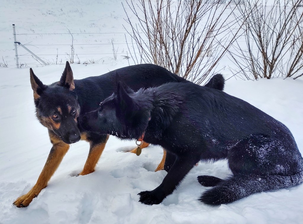 Uncle Jingles brought my brother Cruize over to play and that helped me to feel better. Cruize is only 9 years old (in dog years, remember?) and I am a teenager. Now it’s up to me to teach Cruize everything our Dad taught me. Cruize can be a pain, but we love to play and play and PLAY in the snow together!